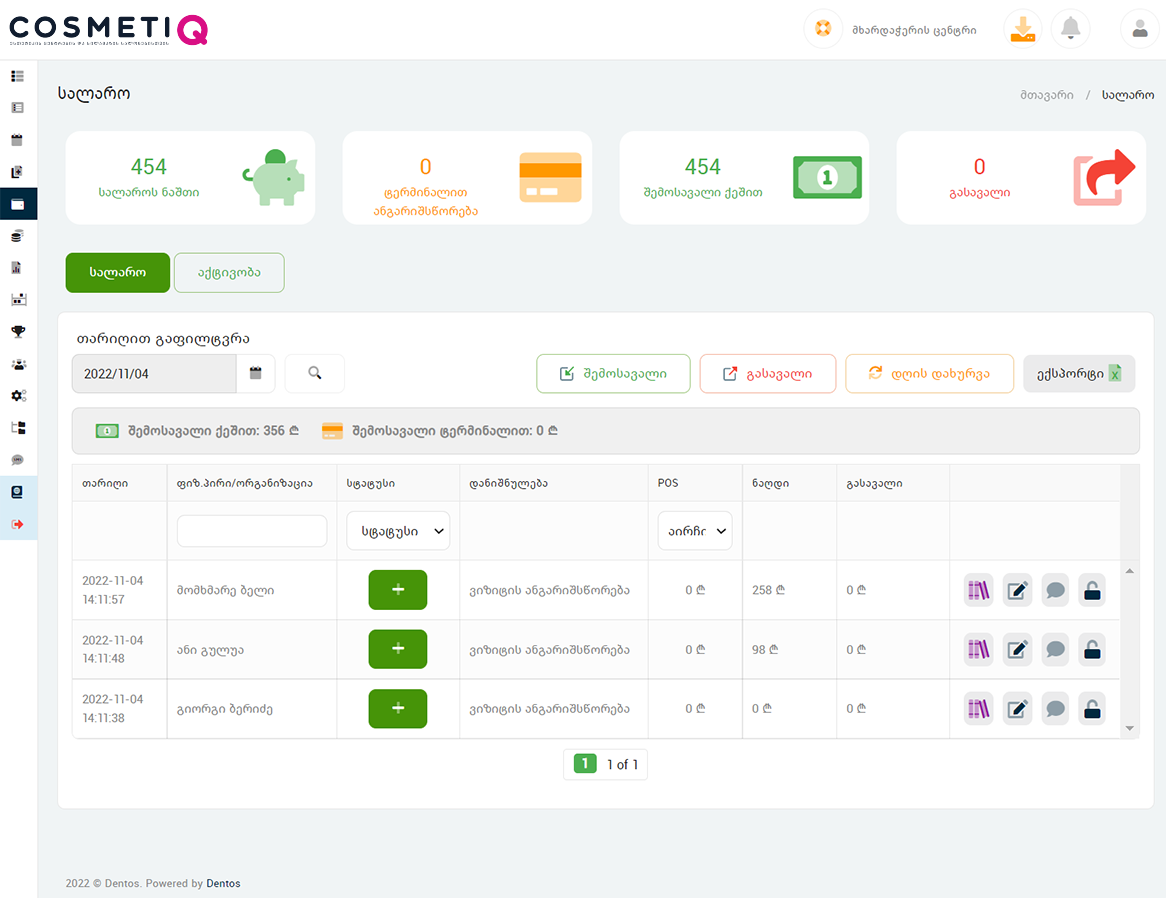 სალაროს ყოველდღიური ბრუნვა, ნაღდი და ტერმინალით ანგარიშწორება, სალაროს ოპერაციები, შემოსავლის ორდერები.